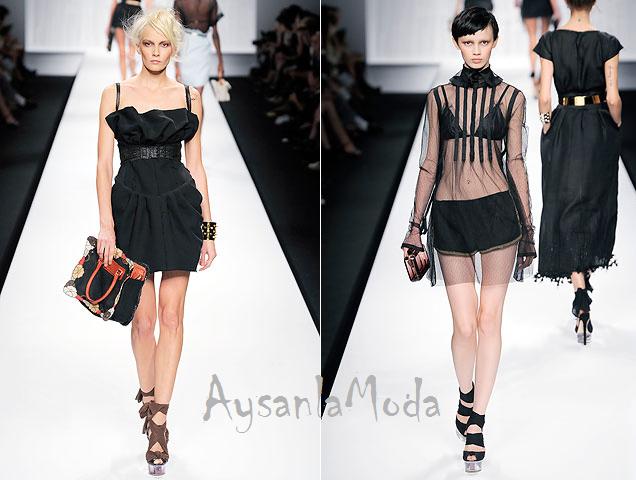 Roberto Cavalli'den bu kez farklı bir hamle geldi.Genellikle cazibeli tasarımlarıyla tanınan marka bu sezon maskülen bir romantizmi tercih etti.Uçuş uçuş şifon elbiseler bize adeta yazı anlatıyor.Koleksiyonun lokomotif parçası halinde olan bu şifon elbiselerin yanı sıra göze çarpan diğer detaylar;etek-ceket takımlarda şifon detaylar,blazer ceketler,kuşaklar ve yüksek belli kumaş pantolonlardı.İndigo mavisi koleksiyona gizemli bir hoşluk katıyor..jpg)